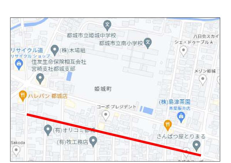 姫城中学校の南側の道路(下図の赤線箇)で、水道工事が始まります。