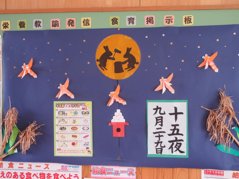 本日9月29日は十五夜です。先日、十五夜の由来やお供えなどの放送があり、写真のような掲示物も貼られています。生徒たちは、そんな話や掲示物を思い浮かべながら、今夜は空を見上げることと思います。