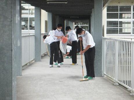 6月3日(水)、昼休み、約10名の2年生が自主的に2階渡り廊下を職員と一緒に清掃していました。コロナウイルスのため、普段の生活が送れない毎日ですが、何だか「ほっ」とする光景でした。ありがとうございました。(教頭:鎌田浩二)