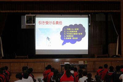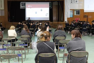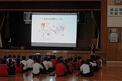 3月6日(金)の5・6校時、本校体育館にて3年生を対象とした「性教育講話」を行いました。 今回は、宮崎か母ちゃっ子くらぶより助産師の方を講師にお招きし、これから新しい世界へ羽ばたく生徒たちへ向けて、大切なメッセージを届けていただきました。