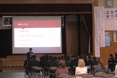 身近な社会人としての経験に基づいた熱いメッセージに、生徒たちは真剣な表情で聞き入っていました。「今の自分に何が必要か」を考える、立志式にふさわしい大変貴重な時間となりました。