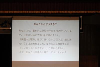 後半には、「家に誰もいない時、遊びに来ないかと誘われたら?」という具体的な場面を想定したワークショップを実施。生徒たちは「自分ならどう答えるか」「相手の気持ちをどう尊重するか」について、周囲の友人と真剣に意見を交わしていました。