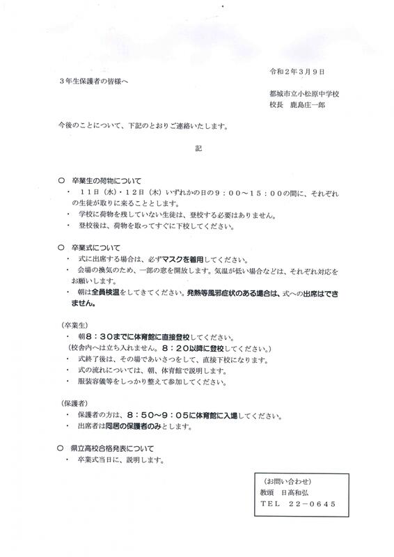 今回、新型コロナウイルスの影響により、在校生の皆さんに直接、お伝えできませんが、私たちが有意義な日々を過ごせたのは、在校生の皆さんのお陰でもあり、感謝しています。これからも、小松原中学校の伝統を引き継ぎ、自分や仲間のために、積極的に行動してほしいと思います。