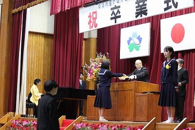 3月16日(日)に第77回卒業式が行われました。都城市教育委員会教育委員、岡村夫佐様をはじめ学校運営協議会委員、各地区自治公民館館長・副館長、民生委員児童委員、約30名のご来賓の皆様のご臨席のもと、多数の保護者、ご家族の見守る中、鈴木一成校長より卒業生一人一人に卒業証書が手渡されました。