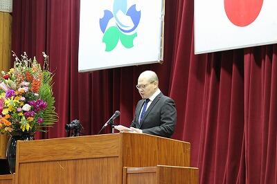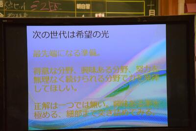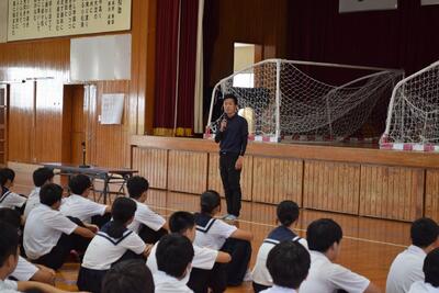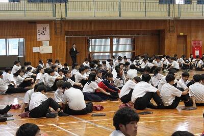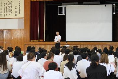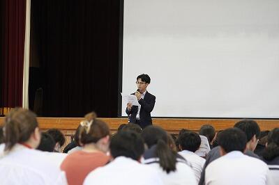 さらに、鈴木校長が木村つづく氏とは中学校時代の同級生であり、ご来賓の池田都城市長とは高校時代の同級生であるというご縁も紹介されました。講演会の最後に、池田市長から2年生へ応援メッセージが送られました。