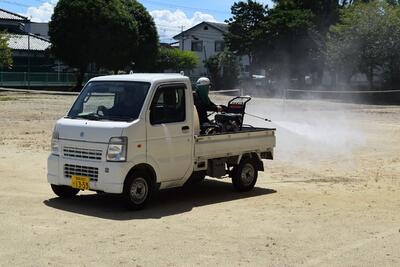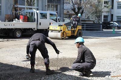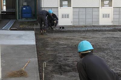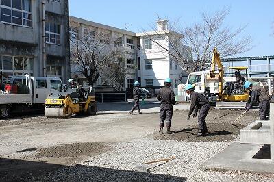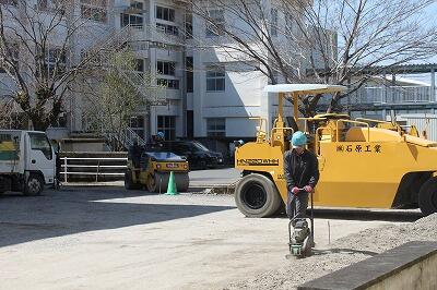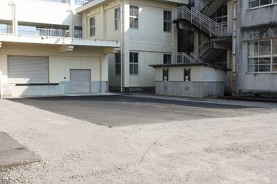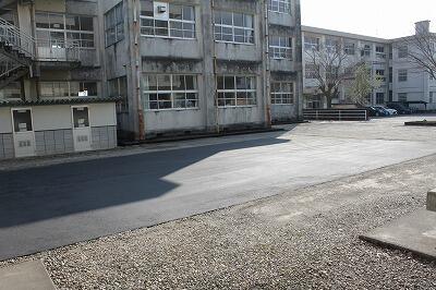 前回、コンテナ室の屋根の防水と床の嵩上げ工事の様子をお知らせしましたが、今回は3月20日(木)から21日(金)にかけて、大王小学校駐車場入り口から本校コンテナ室前にかけての通路の舗装とシャッターの修理工事が行われました。大王小学校駐車場入り口からコンテナ室前にかけての通路は、毎日の給食用の大型コンテナ車の通行によりかなり路面が荒れ、簡単な応急措置では対応できない状況までに至っており、雨の日は大きな水たまりが数カ所できていました。そこで都城市教育委員会より舗装工事をしていただくことになりました。舗装により、コンテナ車の運転については横揺れを気にせずに行えるようになりました。