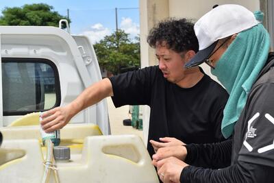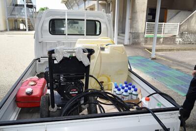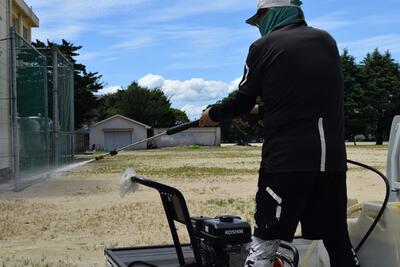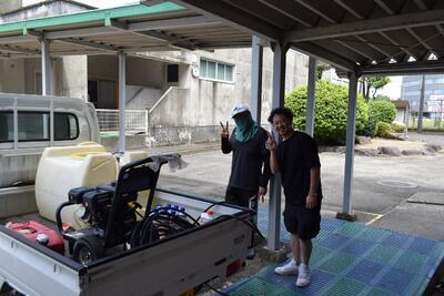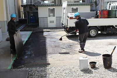 コンテナ室屋根の防水工事は、エヌテクノ様が担当されました。まだ朝の気温の低い時間から、屋根の汚れを高圧洗浄機で洗い落とす作業からスタートし、防水シートの張り替えや塗装をすることで、見違えような美しい屋根に仕上がりました。