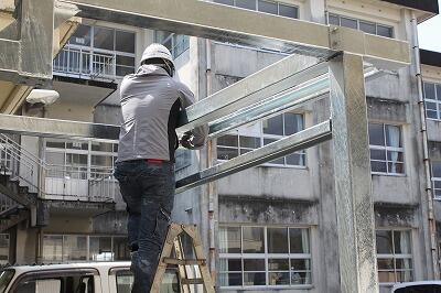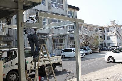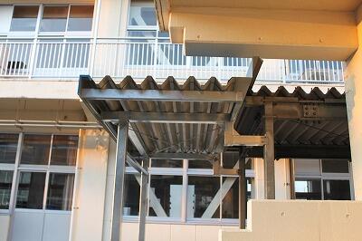 コンテナ室関係の工事を立て続けに行ってもらっていますが、今回はコンテナ室北側にある通路の、屋根の取り付け工事が行われました。コンテナ室から給食用の食缶や食器を、給食当番が教室まで運んでいく際に通る通路なのですが、なぜか屋根が途中までしかなく、雨の際は濡れてしまっていました。今回の改良工事で安心して通行できそうです。