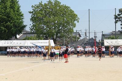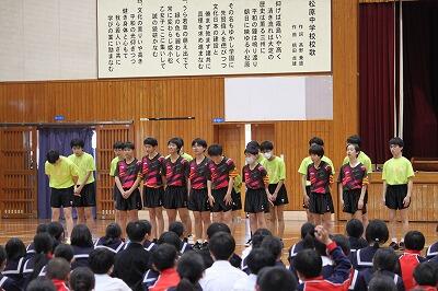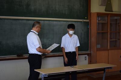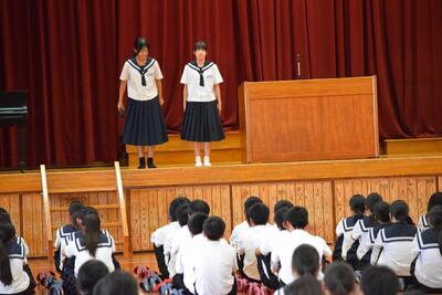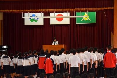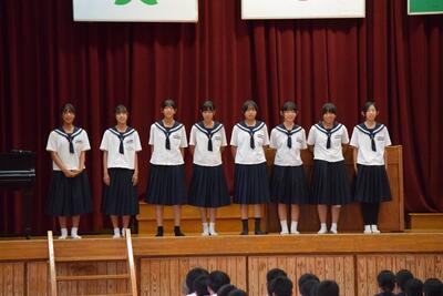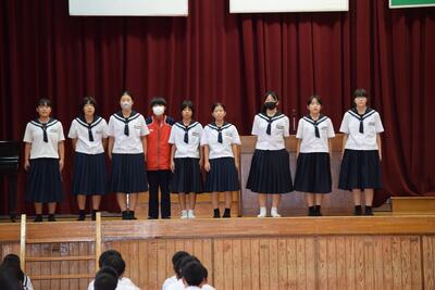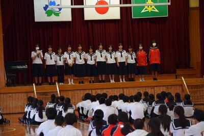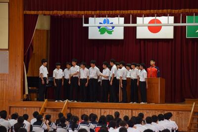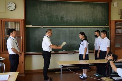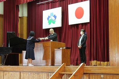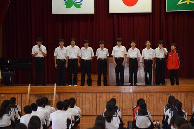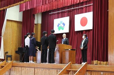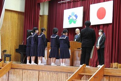 式に先立って表彰式が行われ、ソフトテニス部と卓球部の大会入賞をはじめ、書写展、多読賞、市の精励賞、科学の甲子園ジュニア全国大会、小さな親切運動、さらに全校学習委員会から計算力コンクールなど、多数の表彰がありました。