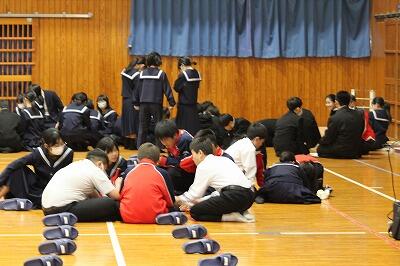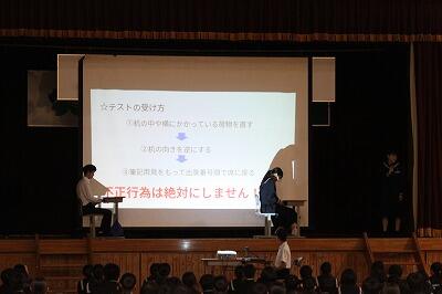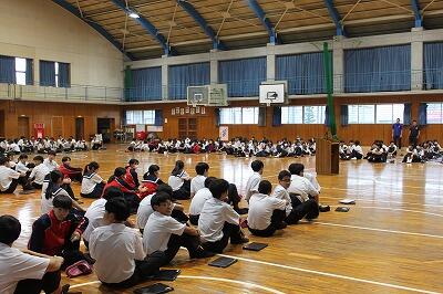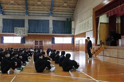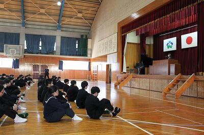 3年生は、1月27日(月)6校時に体育館において、28日(火)から始まる私立高等学校入学試験に向けての事前指導が行われました。当日までの準備や心構えなど全体指導の後に受験校別の指導がありました。