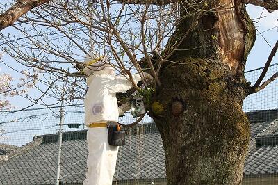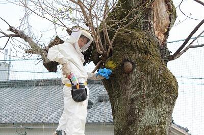 花だけでなく、昆虫も動きが盛んになったようで、テニスコートに多数のミツバチが飛来し、練習を中断するほどでした。そこで、専門の業者の方に調べていただいたところ、テニスコートそばの栴檀の木にうろがあり、その中に巣を作って、以前より蜂蜜を集めていたことが分かりました。巣の近くにスズメバチも飛んでいたことから、ミツバチの巣を駆除することになりました。