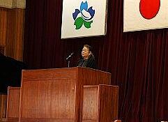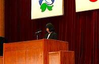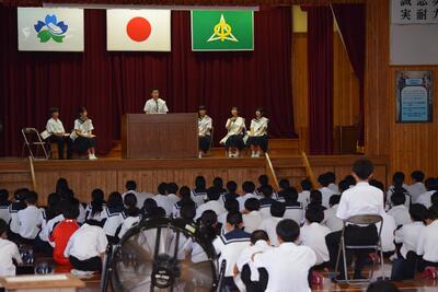 第2部では、3年生も加わり、ラジオ番組やテレビ番組のMCをつとめ、みゃこんじょ大使を委嘱されている、フリーパーソナリティーの木村つづく氏を講師に招き、記念講演が行われました。講演のテーマは「前進力」で、木村氏は「笑顔、聴こう、人生一度きり」の3つのポイントで話を展開されました。講演では、人の話を聞く際は自分の話をしない、自分が話す際はゆっくり、はっきりと短く話すことなどがアドバイスされました。