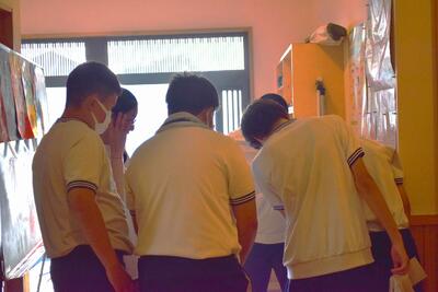 特に、「立志の誓い(個人)」では、生徒それぞれが、自分の足型を色絵具でペイントした色紙に、毛筆で立志の言葉を書き込み、それをオリジナルの額縁に入れたものを掲げ、自分の誓いをはっきりと述べていました。