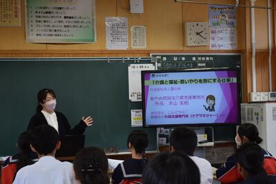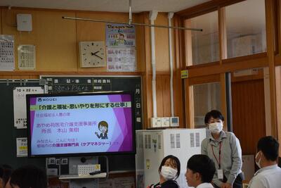 高齢化社会が進み、高齢者の特性を理解して対応していくことが身近な課題となってきています。これは家庭科の家族や地域の人々とのかかわりで高齢者について取り扱う内容であります。専門的なスキルのある地域人材を活用することで充実した学びとなり、認知症患者に対してサポーター(応援者)の育成へとつながると考えます。この講座を通して認知症への理解を深め、高齢者への接し方や対応法などを学び、今後交流・啓発していく機会としていくことがねらいです。