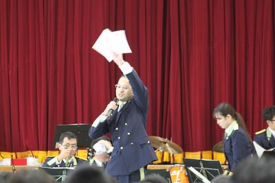 〇生徒による指揮者体験: 音楽隊を前に生徒が指揮に挑戦し、会場を沸かせました。
