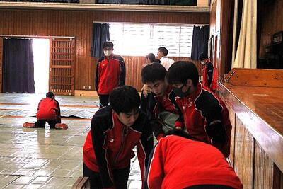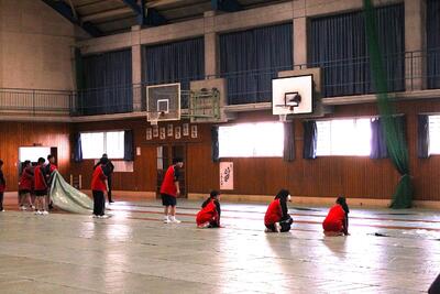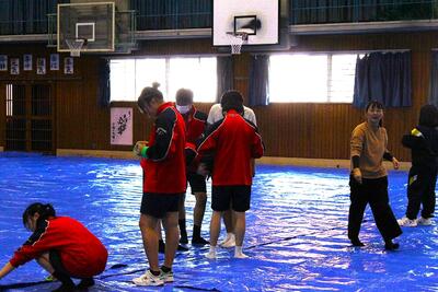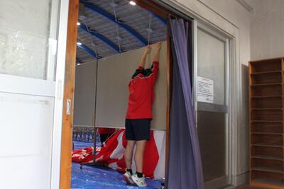 〇体育館: 観客用の椅子並べ、掲示パネルの設置、さらに、体育館が外履きで入れるよう、通常のシートの上にブルーシートを丁寧に敷く作業などを行いました。