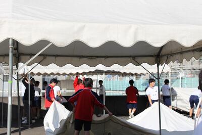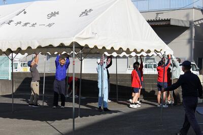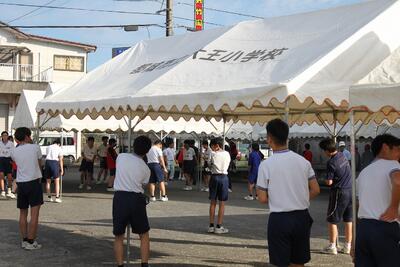 〇屋外(運動場・駐車場): 各公民館や大王小PTA、本校PTAなどの出店で使用するテント張りを協力して行い、お祭りムードを高めました。