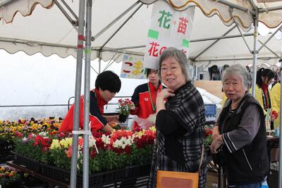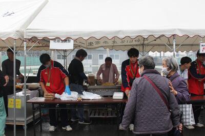 〇地域貢献の取り組み②:出店サポート 体育館外の出店エリアでは、各自治公民館や小・中学校PTAなどの出店が並び、「こまボラ」約40名が、花の苗や焼きそば、ラーメンなどの販売のお手伝いをし、お祭りの活気を支えました。