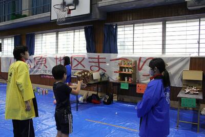 体育館内の体験コーナーでは、「こまボラ」スタッフと大王小学校のボランティアが企画・準備した射的やペットボトルボーリングが行われ、幼稚園児や小学生の笑顔が溢れました。