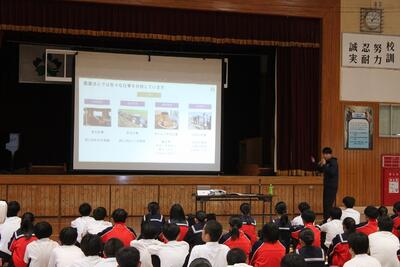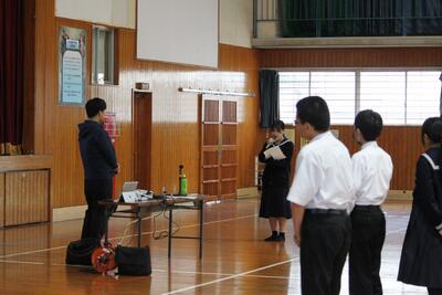11月11日(火)の6校時に、都城市・三股町合同教育研究会 技術・家庭科【技術分野】に関連した出前授業を、本校2年生全員を対象に体育館で実施しました。