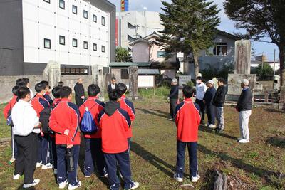 活動を始める前に、招魂塚の歴史的な背景や由来について説明を受け、地域の方々やロータリークラブの皆様と共に作業に取り組みました。