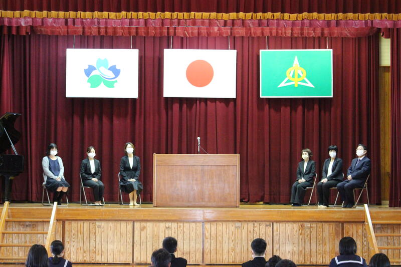 新任式では、新しい校長先生をはじめとして、4月1日付けで本校に赴任された9名の先生方を紹介し、お一人ずつ挨拶をいただきました。その後、生徒会長が歓迎の言葉を述べました。