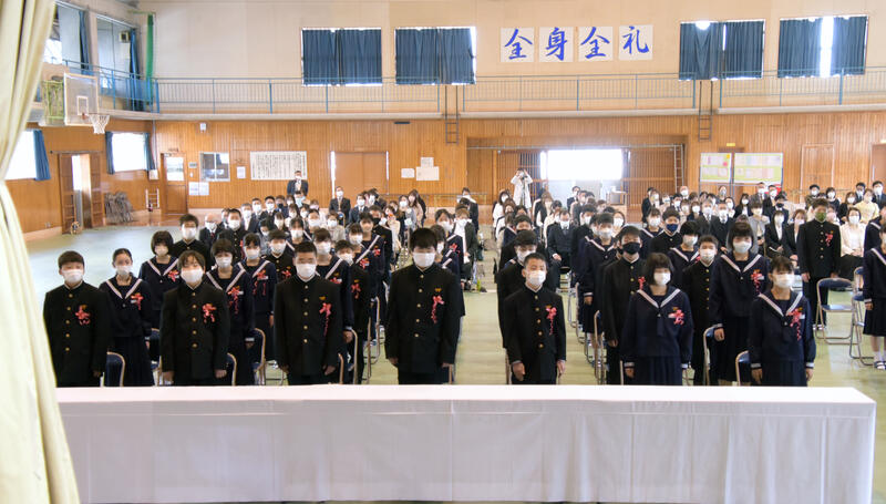 本年度の入学式も新型コロナウイルス感染症対策のため、保護者については各家庭2名までと制限し、在校生(2・3年生)の参加については代表生徒1名のみ、来賓については市教育委員会からとPTA役員代表のみ、職員は学年関係職員の参加で行いました。