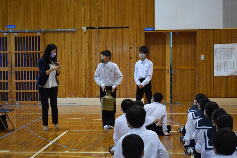 新型コロナウイルスの感染防止と寒さ対応の為、終業式をリモートの形で行いました。終業式の前に、明日のアンサンブルコンテストに参加予定の吹奏楽の生徒3名による演奏を披露する機会がありました。3人の息がぴったりと合ってリズミカルな演奏を味わうことができました。