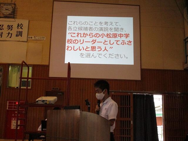 立候補者は自分の今後の取組についての説明を熱心に伝え、最後のアピールを頑張っていました。聴く側も真剣に耳を傾け、今後の小松原中学校のリーダーを誰にしようかと考えていました。