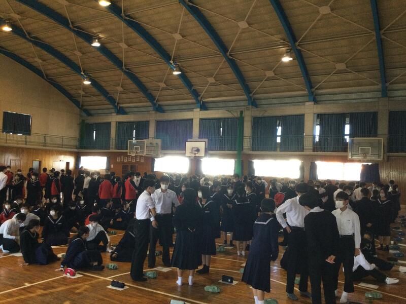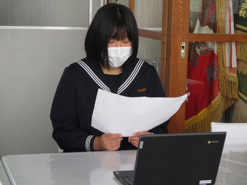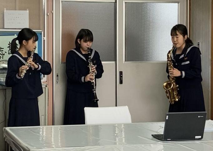 新型コロナウイルスの感染防止と寒さ対応の為、終業式をリモートの形で行いました。終業式の前に、明日のアンサンブルコンテストに参加予定の吹奏楽の生徒3名による演奏を披露する機会がありました。3人の息がぴったりと合ってリズミカルな演奏を味わうことができました。