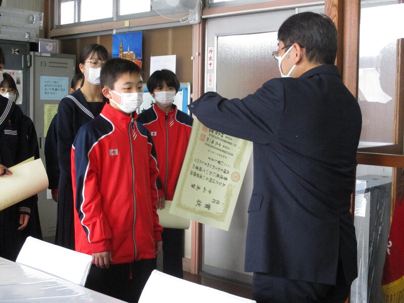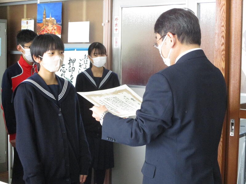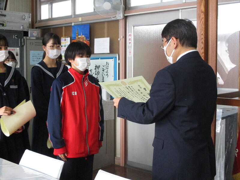 12月22日(木) 終業の日に先立ち、2学期に様々な分野で活躍した生徒の表彰を行いました。新型コロナウイルス感染症の防止と寒波への対応で、明日の終業式がリモート開催となるため、全校生徒の前ではなく校長室での表彰式となりました。