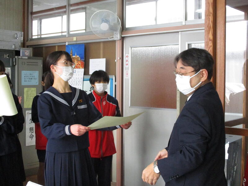 式の内容は、各学年の代表生徒による「3学期の抱負」、校長の話でした。式後には、部活動関係の表彰も行われました。