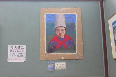 本校美術科担当の河野宗平先生による美術作品が、現在、管理棟階段の掲示板に展示されています。河野先生ならではの個性的な画風が光る作品もあり、生徒たちは美術室への移動の際に足を止め、熱心に鑑賞し参考にしているようです。