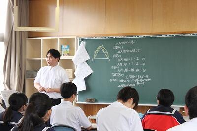 29日(火)には、数学の研究授業が3年3組で行われました。中点連結定理の利用についての授業でした。この日は、福岡大学からも担当の先生が来校され、授業の様子をご覧になりました。