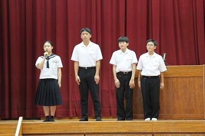 12日(木)5校時の2学年集会では、全国大会出場に向けての壮行会が行われました。学年代表が応援メッセージを送ったり、エールを全員で送ったりしました。そして3名それぞれが、決意表明をしてくれました。全国大会でも、いつものチームワークの良さが発揮できることを期待したいです。