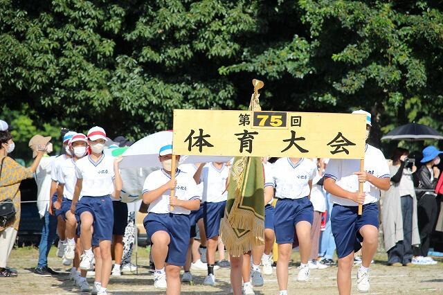 ☆台風の影響が心配された第75回体育大会でしたが、青空の下、開催することができました。今回は、コロナ感染症対策として観覧者については各家庭2名として個人での防止対策を徹底していただき、昼食をはさんだ午後までの開催としました。来賓として学校運営協議会委員長の桑畑様と大王小学校小島校長先生をお招きして生徒の様子を見ていただきました。