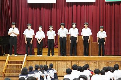その後、激励式に移り、表彰された2つの部と、地区予選大会がなく県大会が最初になる男子ハンドボール部を加えた3つの部が、県中学校秋季体育大会に向けた決意表明を行ってくれました。