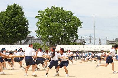 5月18日(土)に、素晴らしい晴天のもと、第77回体育大会が開催されました。大会スローガン「闘 ~勝利への道~」をかかげ、赤・青・黄の三つの団が、団長のもと一致団結し、正々堂々と競技に全力で取り組んでくれました。また、実行委員や競技役員が自分たちで考えながら大会の運営を行ってくれました。ご来賓や地域の方々をはじめ、たくさんの保護者の皆様の声援や励ましのお言葉のお陰で、大変盛り上がることができ、心に残る大会となりました。