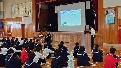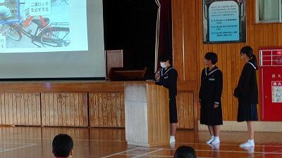 4月11日(木)の3校時に交通安全指導が行われました。生活委員会が中心となり、自転車通学の決まりや現状、交通安全マナーの向上への対策を確認し合いました。