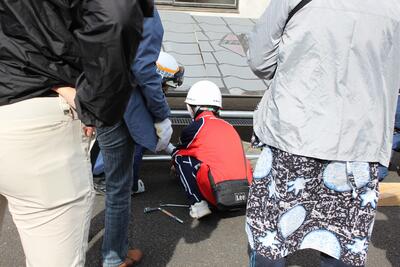 ② バール救助訓練: 閉じ込められた人を救助するための道具の正しい使い方を習得