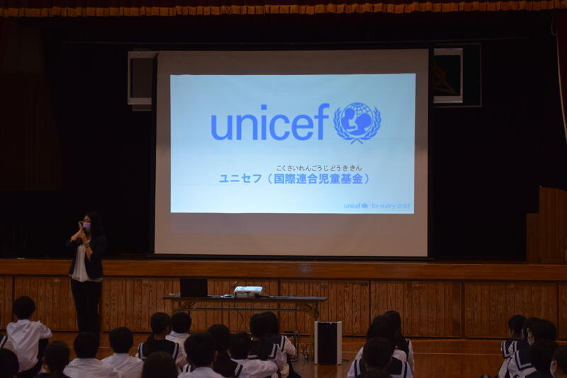 今回は、ユニセフ(国連児童基金)の組織紹介と活動を広く知らせる目的と世界の子どもたちがおかれている状況を知ってもらいたいという思いをもって、全国を回られたということです。日本ユニセフ協会の学校事業部の金子部長と高円主任の2名と宮崎県ユニセフ協会職員の8名が来校されました。