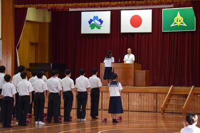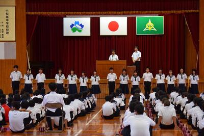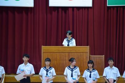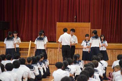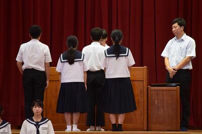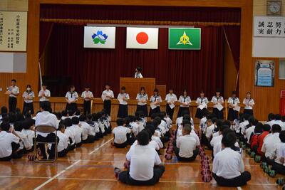 この式典は、生徒会役員選挙で選出された新役員を全校生徒に紹介し、生徒会活動の中心としての自覚を促すとともに、任期を終えた旧役員の1年間の労をねぎらうことを目的として実施されました。
