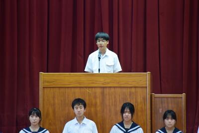 その後、新生徒会長が登壇し、今後の生徒会活動の展望を力強く語り、全校生徒に向けて活動への積極的な協力を呼びかけました。
