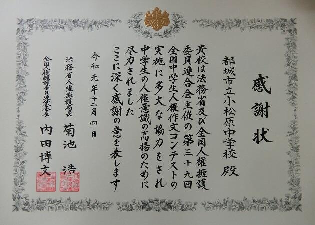 これは、本校の「全国中学生人権作文コンテスト」への取組を評価して頂いたものです。