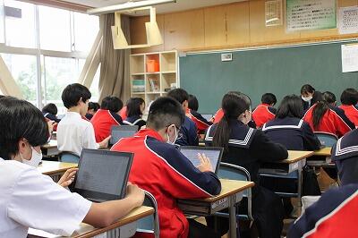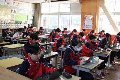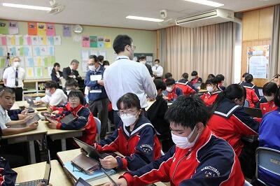 都城市と三股町の社会科の先生方々が参観されるなか、ICTを活用した対話的・協同的な深い学びを行っていました。