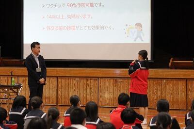 普段あまり耳にしないテーマでしたので、生徒も真剣にお話を聞いていました。子宮頸がんは、宮崎県に多い若い人のがんであること、HPVウイルスが原因であること、ワクチンで90%予防可能であること、世界ではワクチン接種が約20年経過していること、女性だけでなく、男性も関係があること、などを中心にお話がありました。「今まで知らなかった情報をたくさん得ることができた、早速家に帰ってワクチンについて家族と話がしたい」、などの感想をもった生徒がいました。