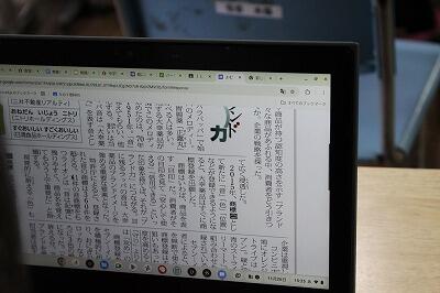 読売新聞社から無償提供された新聞記事をもとに、確認問題が掲載されたワークシートをタブレットに配信し、Googleフォームで10分から15分で回答するようになっています。