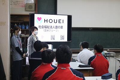 都城市商工政策課に講師の依頼をお願いし、持永木材株式会社(宮本様、瀬之口様)、霧島ホールディングス株式会社(田中様、加藤様)、有限会社新福青果(栗原様)、社会福祉法人豊の里(福留様、小方様)の方々が講師として来校され、40分の講話を2回お願いすることができました。生徒達は交替して2つの事業所の講話を聞くことができ、大変真剣な眼差しで、集中してお話を聞いていました。