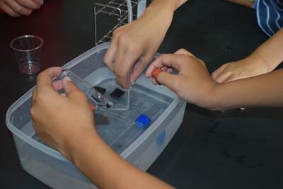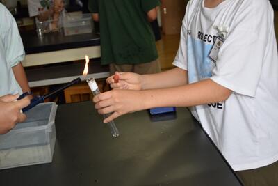 理科:水上置換法による気体の捕集実験に挑戦しました。初めて聞く説明にもかかわらず、班の仲間と協力して手際よく実験を進める姿は、普段の学びの成果が十分に発揮されていることを感じさせました。