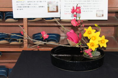 玄関の生け花も季節にあった花に代わったようです。赤色の木蓮が大変きれいです。洋スイセンの黄色も映えています。